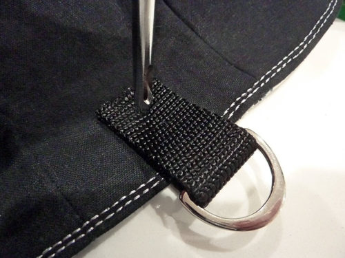 - Place a tabbed D-ring at the exact center of one sidewall. The bottom ends of the tab should be 1¼” down from the top seamed edge of the bag. The looped end with the D-ring should extend about ½” above the top seamed edge of the bag. Pin or clip in place.
