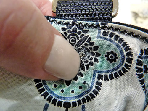 - Using the rivet tools, cut holes for two rivets through all the layers: both of the webbing layers as well as the layers of the bag’s sidewall.