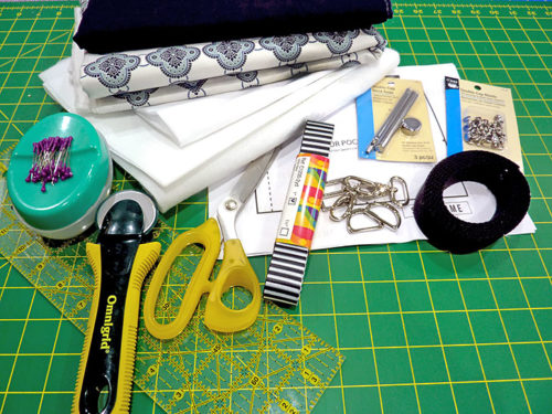 - 2 yards of 1” wide patterned webbing for bag handles and adjustable strap; we used stylish black and white heavyweight nylon webbing from Renaissance Ribbons