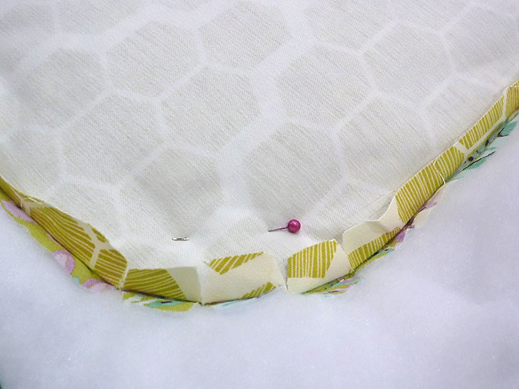 - With the front and back rounded layers still right sides together, and all edges flush, pin along all four sides, leaving an approximate 10” opening along the bottom for turning.
