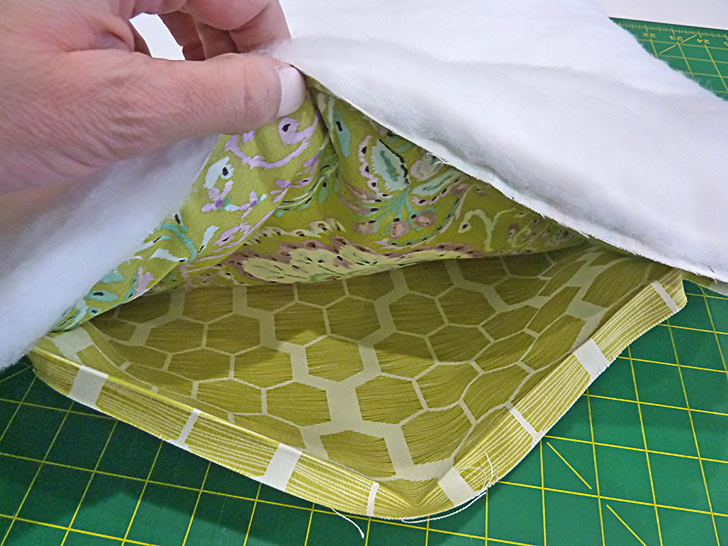 - Set the sewn cover back side up and centered on the stack of batting.