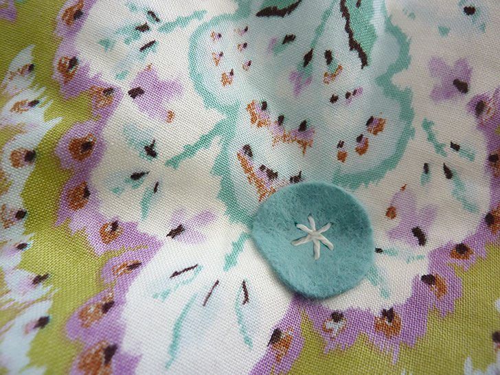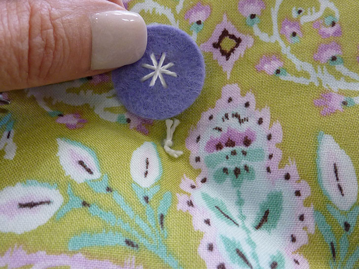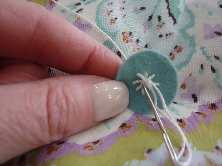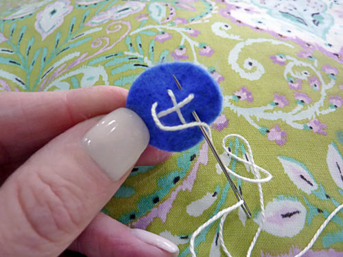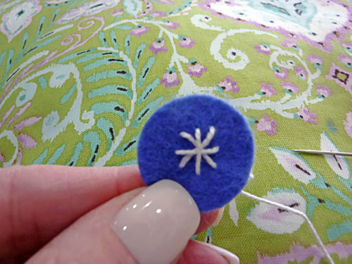 - Pull taut and knot twice under the felt. Clip the ends so they are hidden behind the felt. It’s a bit like sewing a shank style button in place.