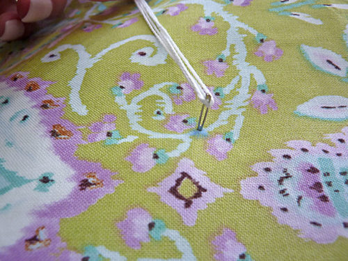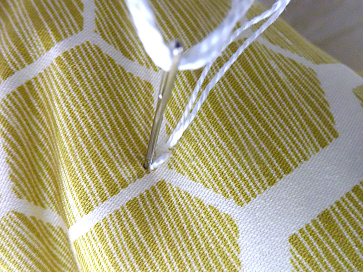 - Insert the needle into a marked point from the front side of the pillow. Leave, and hold onto, a tail of about 5” in length.