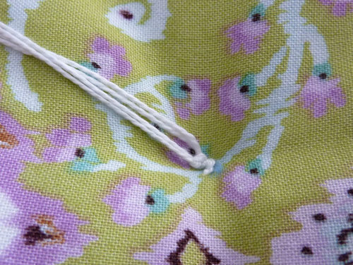 - Slip off the needle and pull the ends of the pearl cotton taut, creating the depression of the tuft. The tightness of the tuft is a matter of personal preference, however, the fibers of the floss and the fabric are likely to loosen with time, so it’s best to pull nice and tight. Tie the ends together into a square knot. Pull taunt and tie a second time.