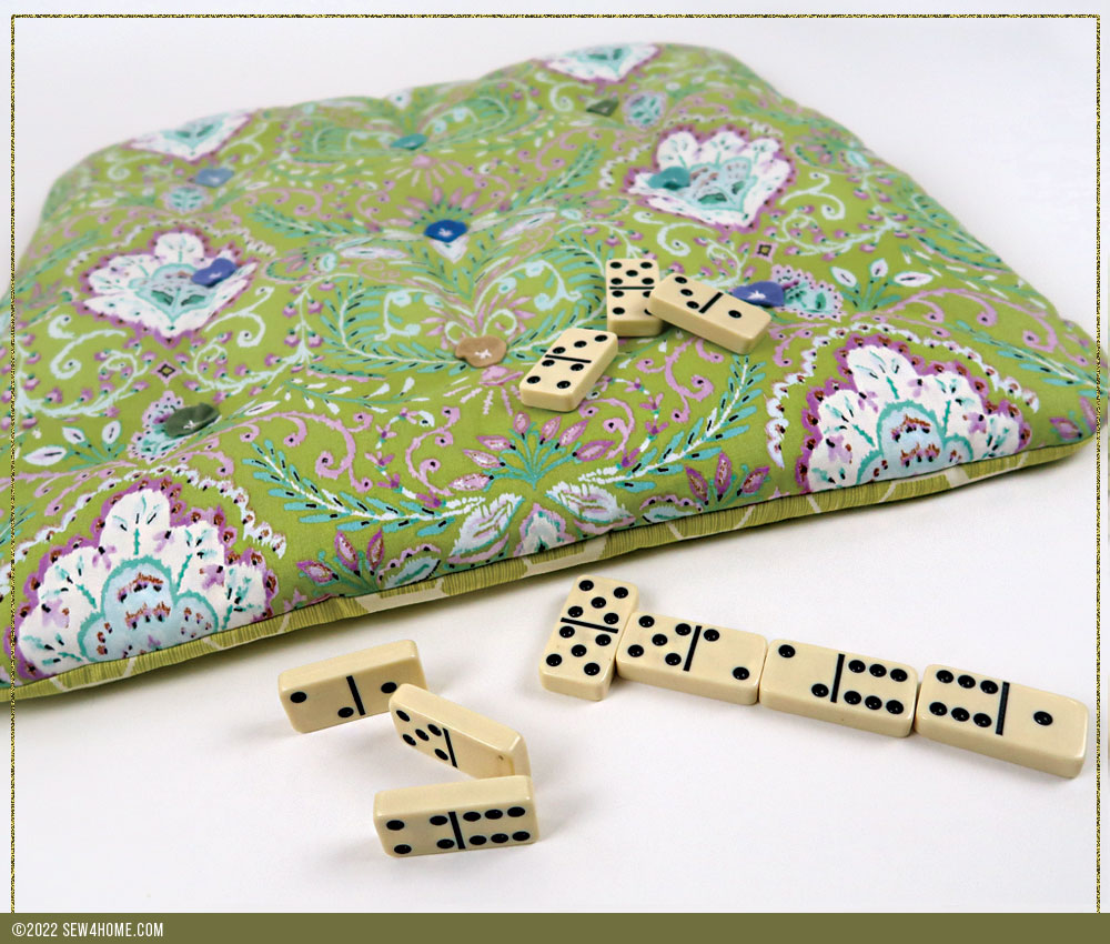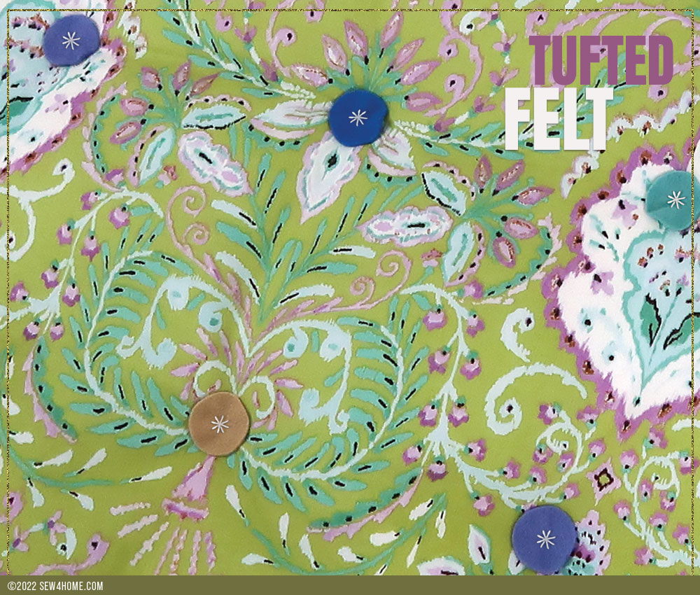 NOTE: Our tufting was done as a two-step process: first tufting with the floss, then securing a pre-embroidered felt circle over each tufted point. The process will be the same whether you use a circle as we did or choose another shape. You can, of course, also choose to change the look of the center pre-stitched embroidery. Finally, you could decide to eliminate the felt accent altogether and use a single X stitch tuft at each point. We do not recommend button tufting – even with tiny buttons – with this slim style, the buttons are likely to be uncomfortable for sitting. For more details about various types of tufting, check out our full tutorial on the technique.