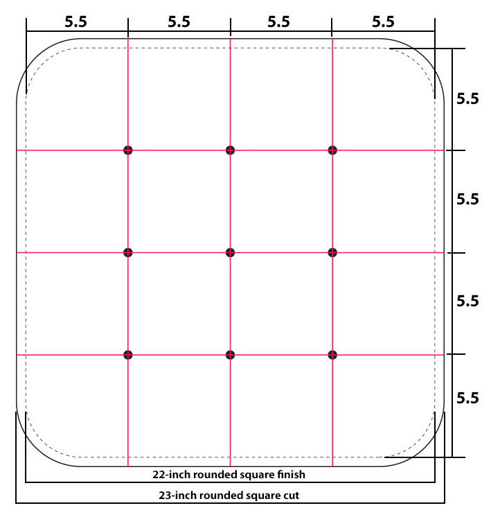 - Below is our recommended placement grid for the NINE tufting points. Based on the accuracy of your cuts and fusing, you may need to adjust slightly. The key is keep all nine points evenly spaced side to side and top to bottom.