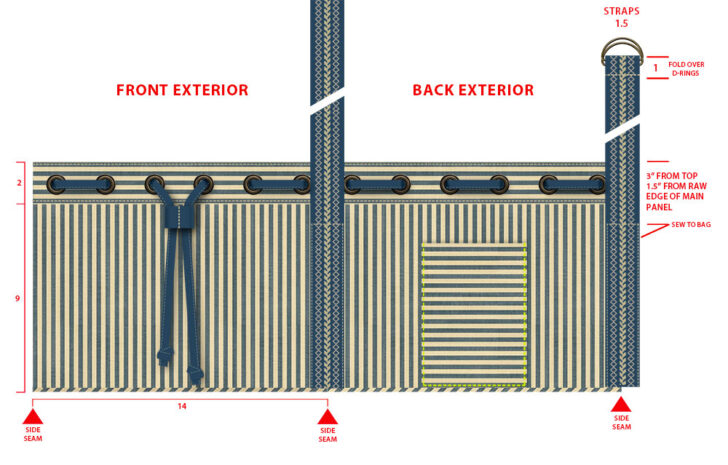 - The drawing below shows a “flattened” view of the duffle that helps visualize what goes where. The edgestitching is shown in a contrasting color to better see its positioning.