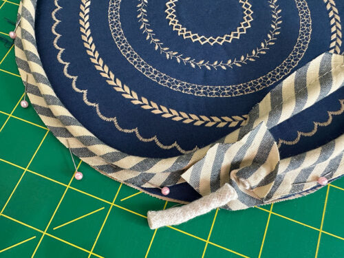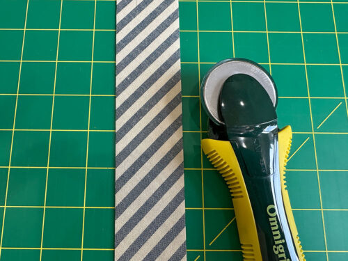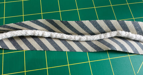 - Find the 2” x 29” strip (the stripe fabric cut on the bias) and the length of ¼” piping cord.