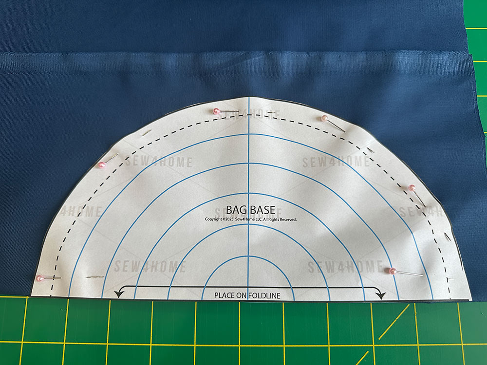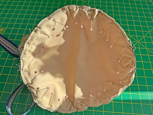 - The bag should still be lining side out. Set the base into the tube so the two pieces are right sides together (it’s a little like setting a lid upside down into a box). Align the four “clock face” pin points of the base to the matching points on the tube. Pin together at these points first, then fill in around the base. Don’t be afraid to use a lot of pins in order to get the two pieces to lay flat against one another. It’s best to pin in small sections, easing as you go.