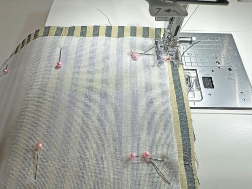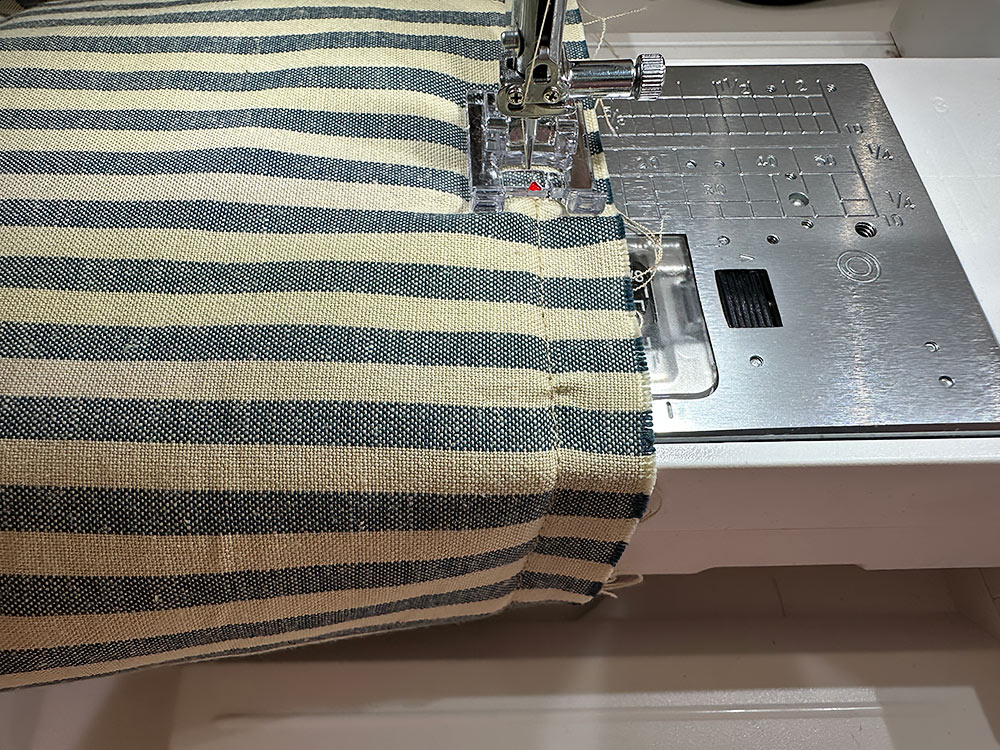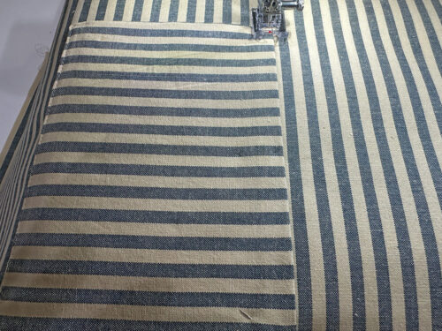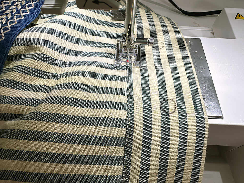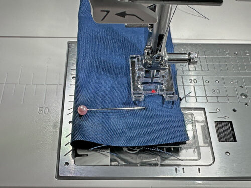 - Using a ½” seam allowance and a standard straight stitch, stitch all the way around. Start and stop at one of the bag’s side seams for the cleanest finish. If your machine has a free arm, now is a good time to use it.