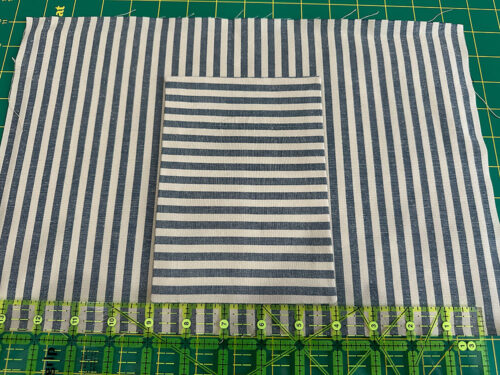 - Place the lightweight interfacing on the wrong side of the base panel, centering it so there is ½” of fabric showing beyond the interfacing all around. Following manufacturer’s instructions, fuse in place.