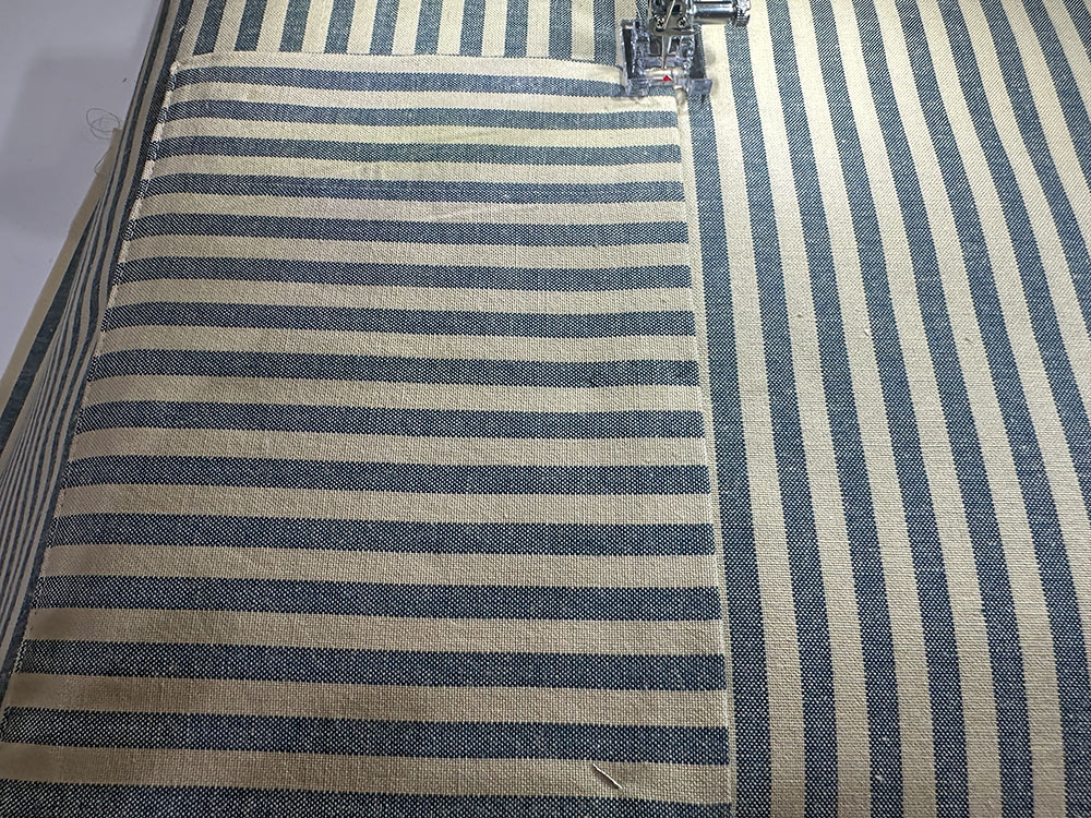 - Keeping the same matching thread in place in the top and bobbin, re-set for a slightly lengthened straight stitch and edgestitch the pocket in place along both sides and across the bottom, sharply pivoting at each corner. This seam closes up the bottom opening.