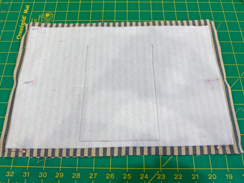 - Find the 6” x 15” exterior pocket panel and the 5” x 14” lightweight interfacing panel. Center the interfacing on the wrong side of the exterior panel so there is ½” of fabric showing beyond the interfacing on all sides. Following manufacturer’s instructions, fuse in place.