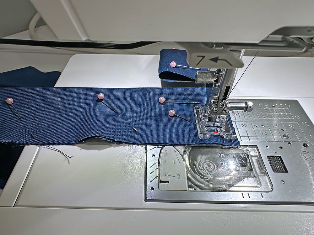 - The machine should still be threaded with thread to best match the strap fabric in the top and bobbin. Continue to use the slightly lengthened straight stitch.