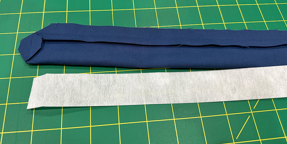 - Find the 1½” x 40” drawcord strip. Fold back each 40” raw edge ¼” and press well. Fold in half, wrong sides together, so the 40” folded edges are flush. Both ends of this strip remain raw. Press well to set a center crease.