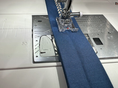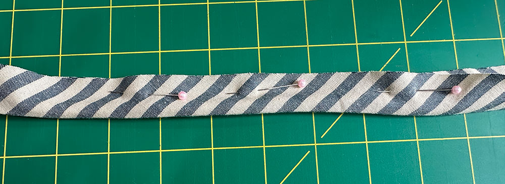 - Press the strip in half then press back each raw edge to meet in the middle. Press well to set visible crease lines. This gives you the same folds you’d see on packaged bias binding. Unfold so all the crease lines are visible.
