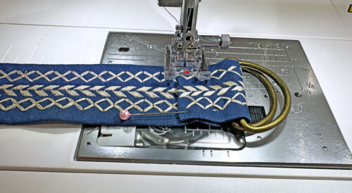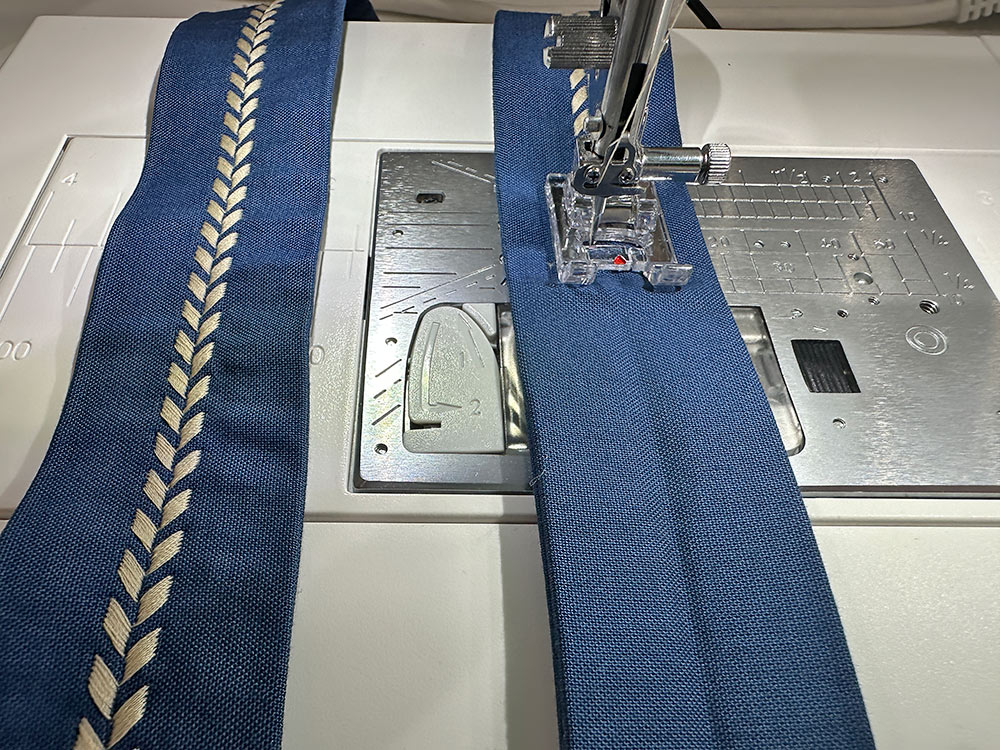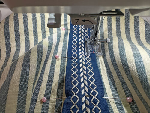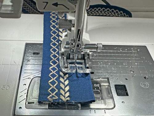We used five different decorative stitches on the base, repeating two of them in straight lines along the two-part strap. Although we often go colorful with our decorative stitching, for this bag, we felt a single color was actually more dramatic than multi-color. A light tan thread on the dark blue of the accent fabric really pops.