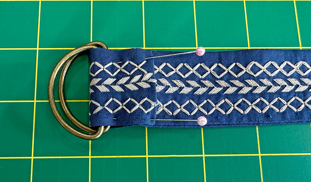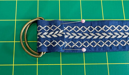 - Fold in half, creating a loop and pin across the raw ends.