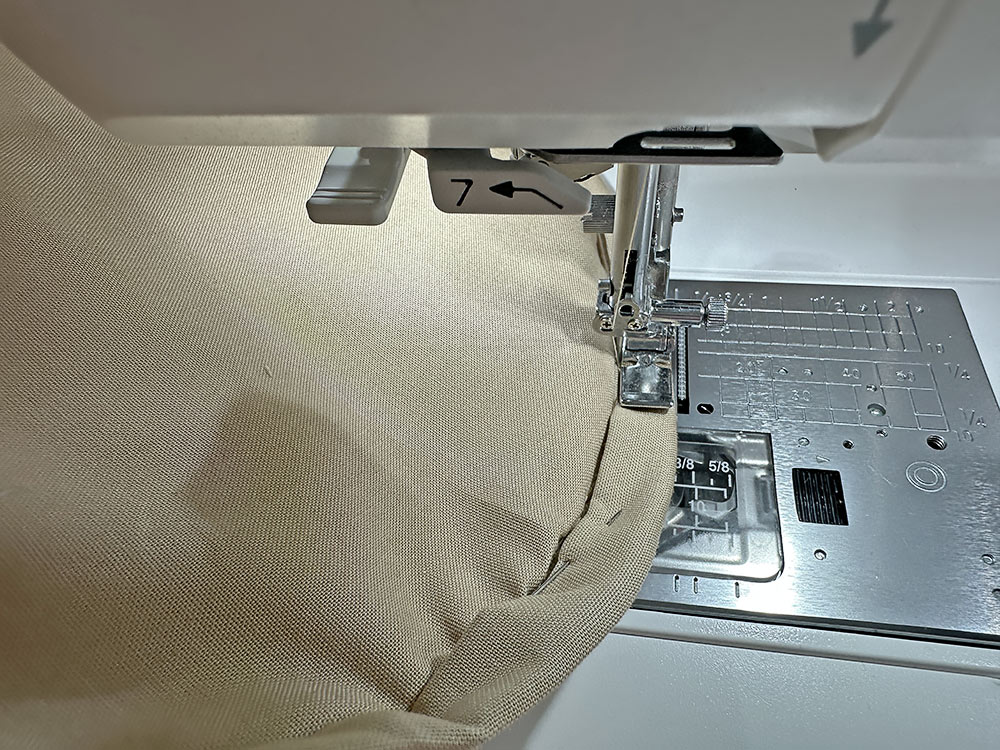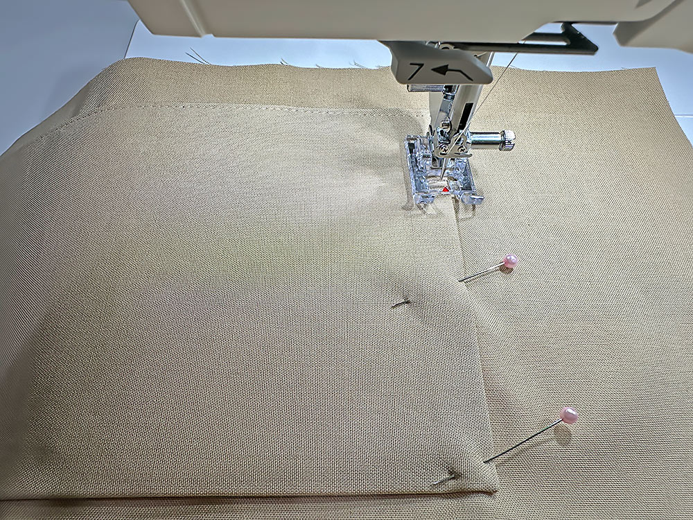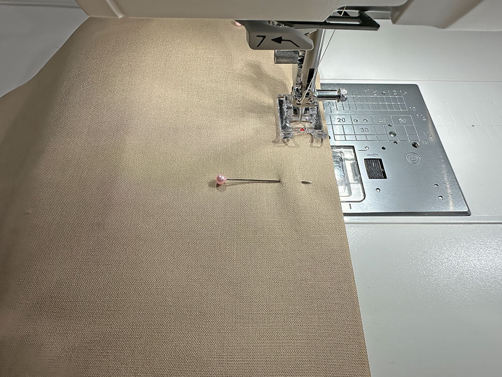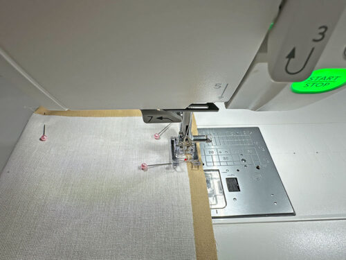 - Your thread in the top and bobbin should blend with your lining and exterior fabrics. We used a light tan. Using a ½” seam allowance and a standard straight stitch, stitch the ends in place.