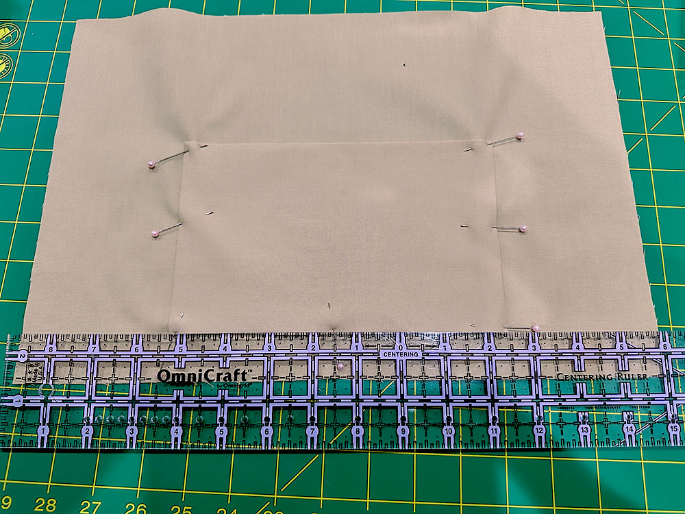 - Place the pocket on top of the back panel, centering it side to side and ¾” up from the bottom raw edge of the panel. Remember, when working with a pocket, the folded edge is the top and the seamed edge, with its opening, is the bottom.