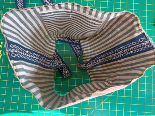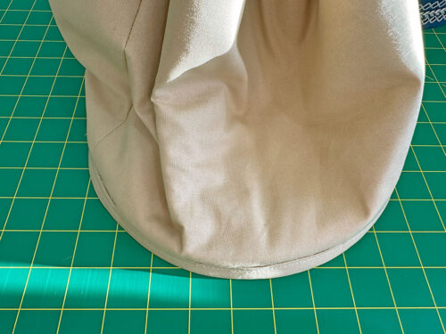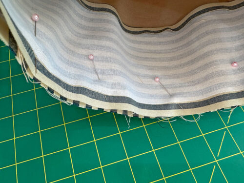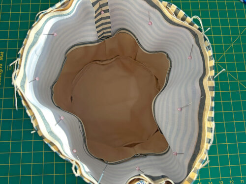 NOTE: If you’ve not inserted a round base before, don’t forget our full step-by-step tutorial you can review with lots of great pictures. - This is the point at which we chose to bind our interior base seam allowance. You could certainly use another type of machine sewn finish – even a simple zig zag stitch or overcast stitch would work. If you want the bound finish we did, find the 2” x 29” bias cut strip in the lining fabric.