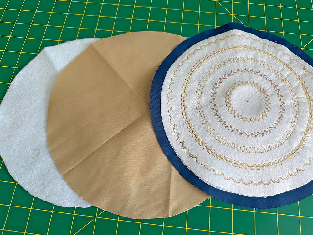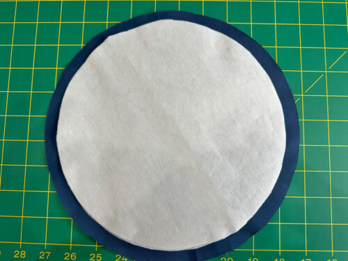 - Flip the base circle to the right side and find its exact center point. Mark this point with a fabric marking tool. The most precise way to do this is to lightly fold the circle in half one way and then half the opposite way, finger pressing to set light crease lines. The cross hairs of the crease lines mark the exact center of the circle.