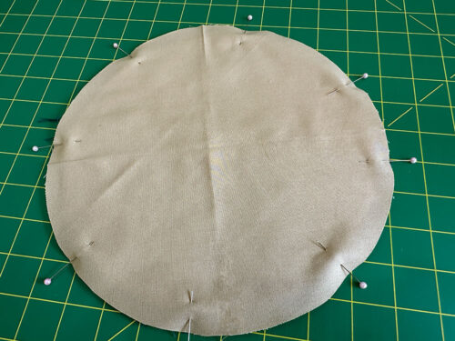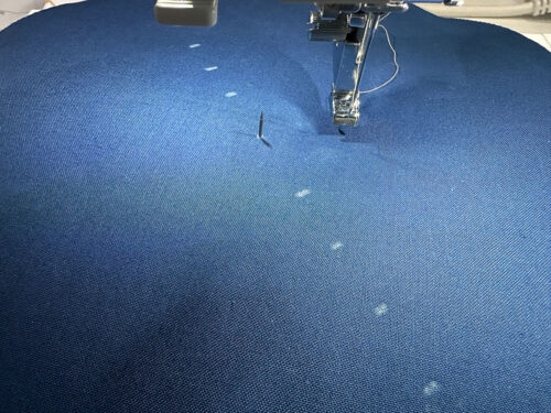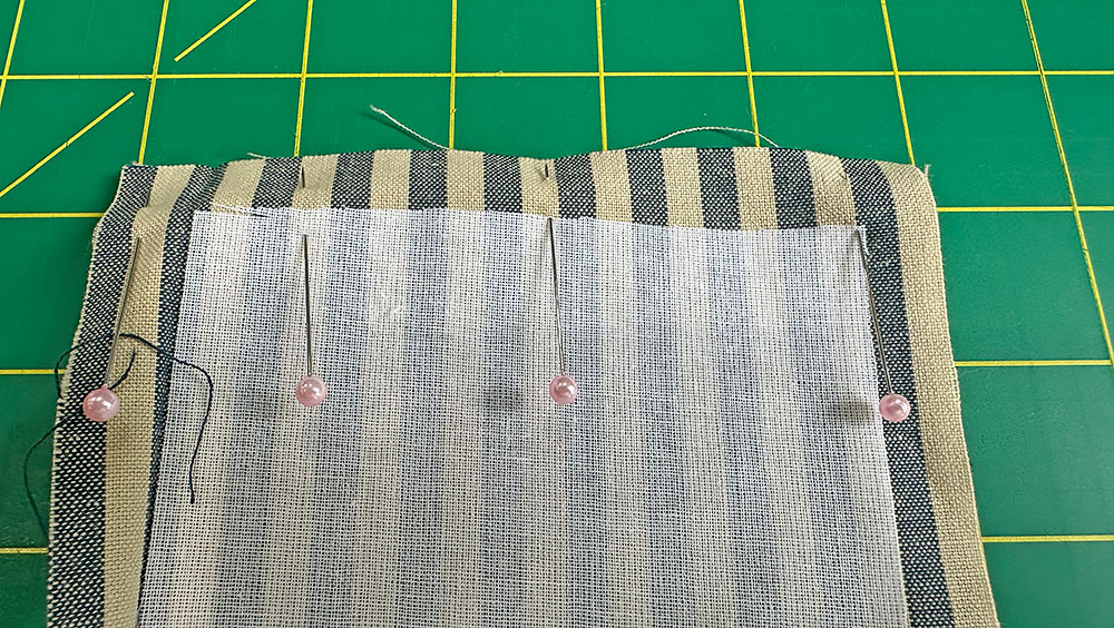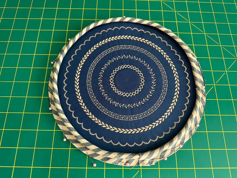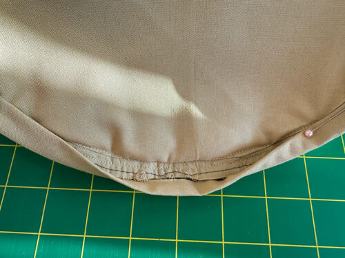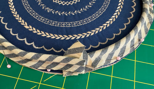 - Leaving about 1” – 2″ free at the head, begin pinning the piping to the base panel. The raw edges of the piping flange/lip should be flush with the raw edges of the base panel unit. Continue around the entire perimeter of the base. If need be, you can clip into the raw edges of the piping to help keep a smooth line. We didn’t find this necessary, but it is an option. Leave a matching 1” – 2” free at the tail end. Lightly pin in place.