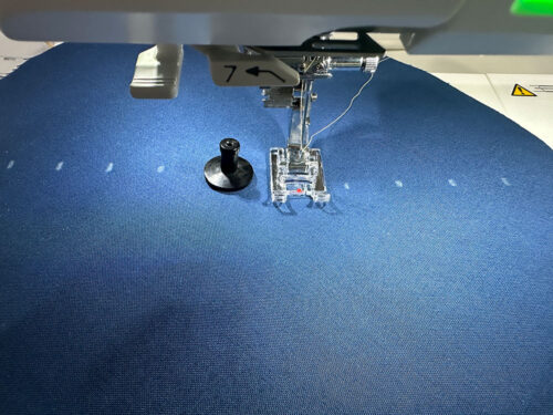 This unique attachment locks into position on your machine and works like a compass to sew a perfect circle every time. We especially love how easy it is to create concentric circles, which is what we did on the base of our duffle. It is very easy to use. We summarize the steps below and link to our full tutorial for even more detail.