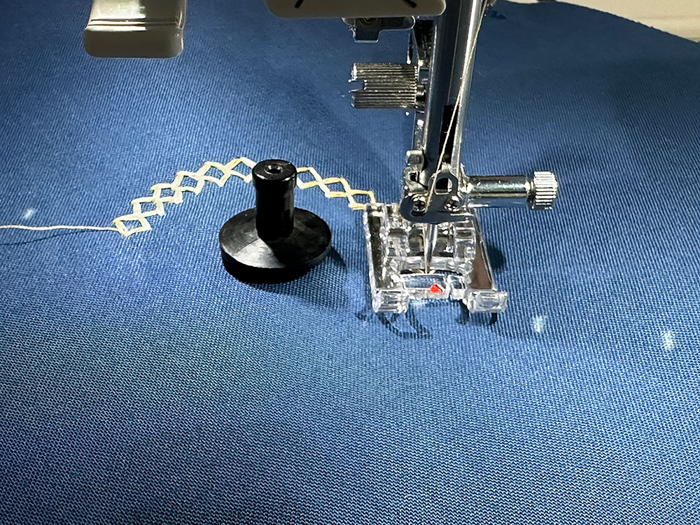 - Thread the machine with thread to best match the piping fabric in the top and bobbin. Attach a Zipper foot.