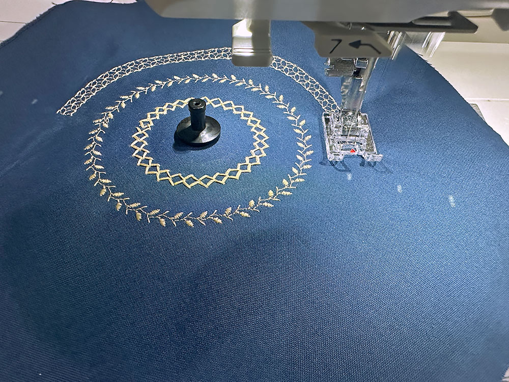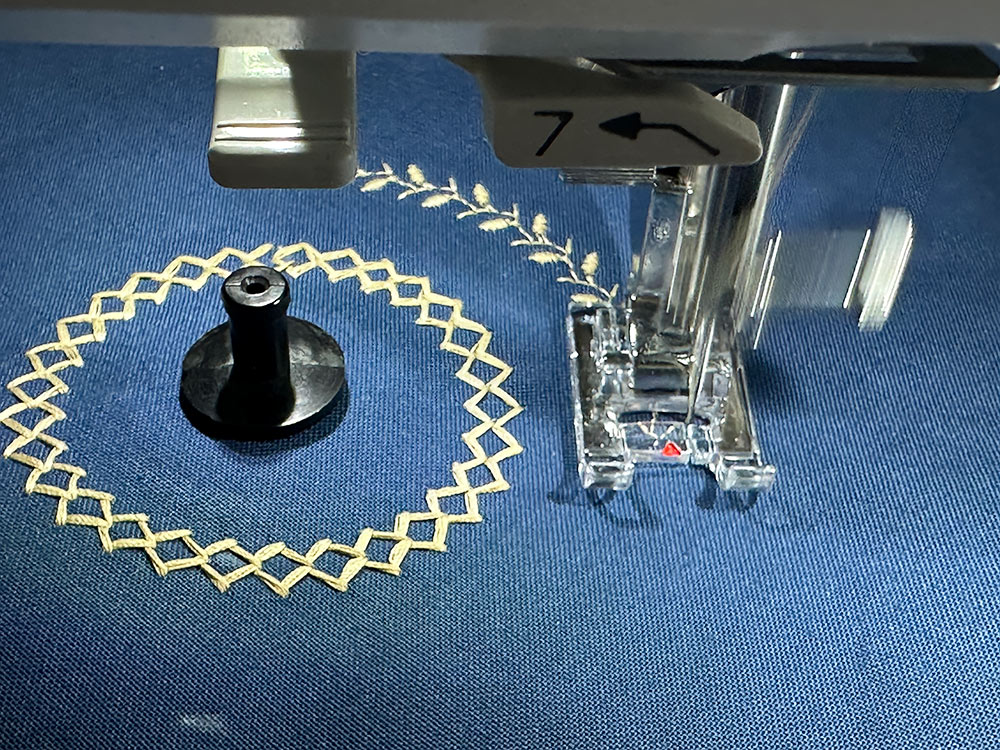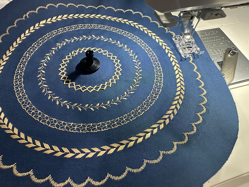 NOTE: We will call out each of the stitch selections we used from the library on our Janome Skyline S9. All were stitched at a 7mm width. You are welcome to pick out your own stitches, but as we always recommend… practice, practice first on scraps to make sure it’s the look you want. - Set the guide on the Circular Sewing Attachment to 1” and select your first stitch – the innermost circle. Our first circle was Decorative Stitch #74.