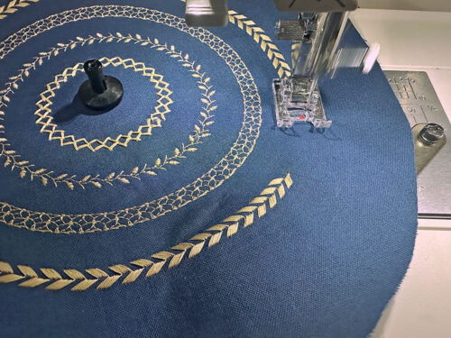 - Move the Circular Sewing Attachment guide out ¾” and set up for the second circle. Our choice was Decorative Stitch #30.