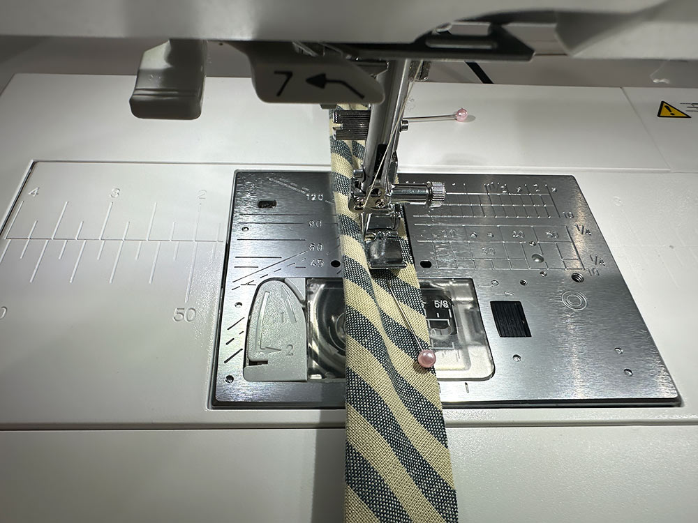 - Place one raw edge of the bias strip against the seam allowance – you are just working with the seam allowance, do not stitch onto the body of the bag. Stitch all the way around, following along in the crease line, overlapping the ends to finish.