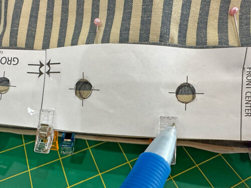 - Cut out the grommet holes from the paper template (you could also do this before clipping in place if that seems easier for you), and using a fabric pen or pencil, trace each of the 12 circles.