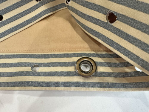 - Cut out each of the marked holes through the layers of the grommet panel and insert all the grommets. We have a full tutorial you can review on setting grommets and eyelets for all the easy steps. Our number one hint is to do your setting on a very hard surface, like a granite counter. It will allow the two parts of the grommet to seat properly with just a couple firm swings of your hammer. That’s the top tip, but the full tutorial has many more!
