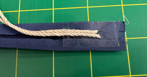 - Find the two 38½” lengths of ⅛” soft piping cord. Open up the folded strip and place the lengths of cord, one on top of the other, down the center. This will add some needed dimension and heft to the drawcord. You’ll end up with ¾” of dead space” at each end that will make it easier to knot the ends, which is the finishing step for the drawcord tails. Tape each end in place with clear cellophane tape.