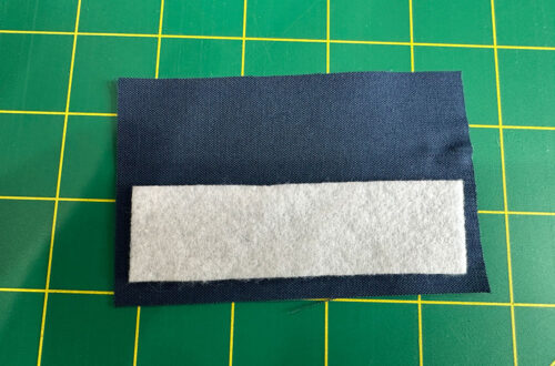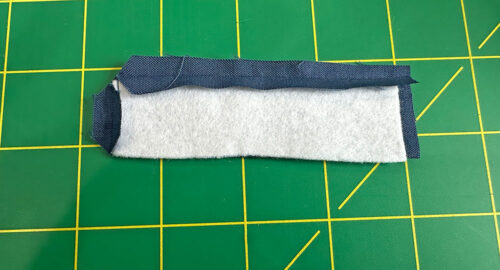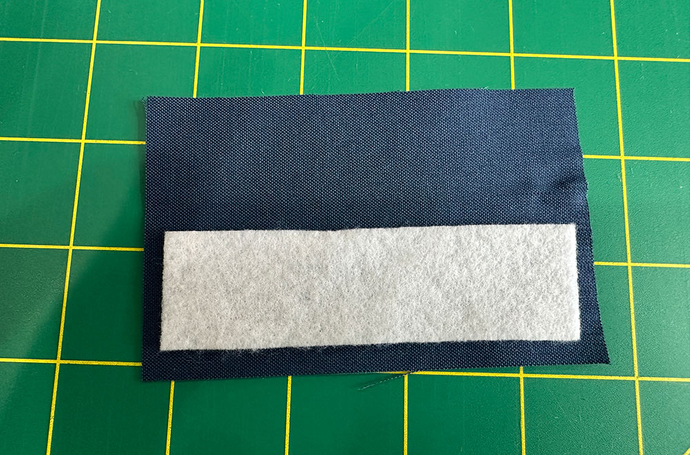 - Find the little 4” x 2½” strip. Fuse the remaining tiny strip of fusible fleece (1” x 3¾”) on one side.