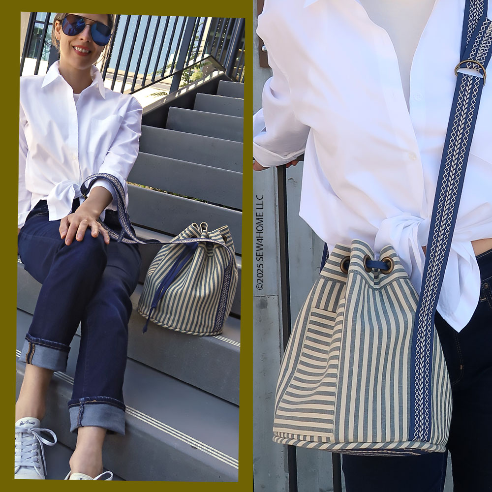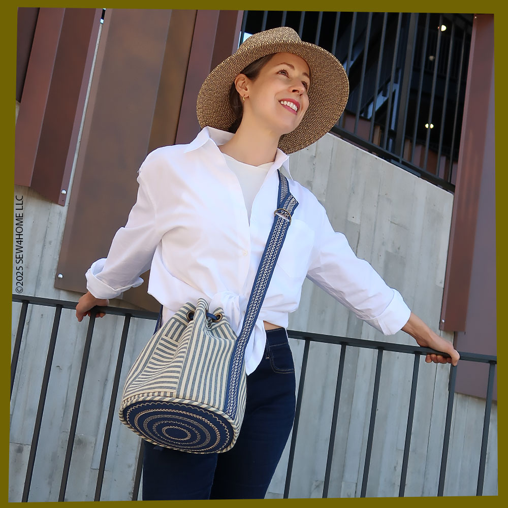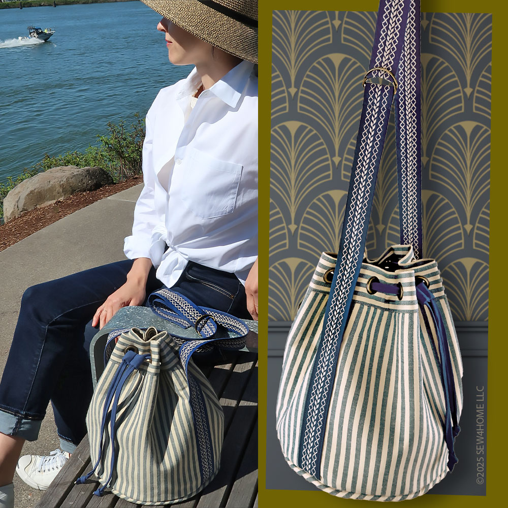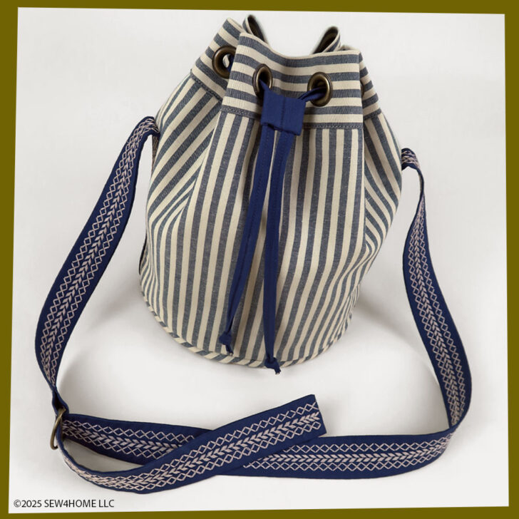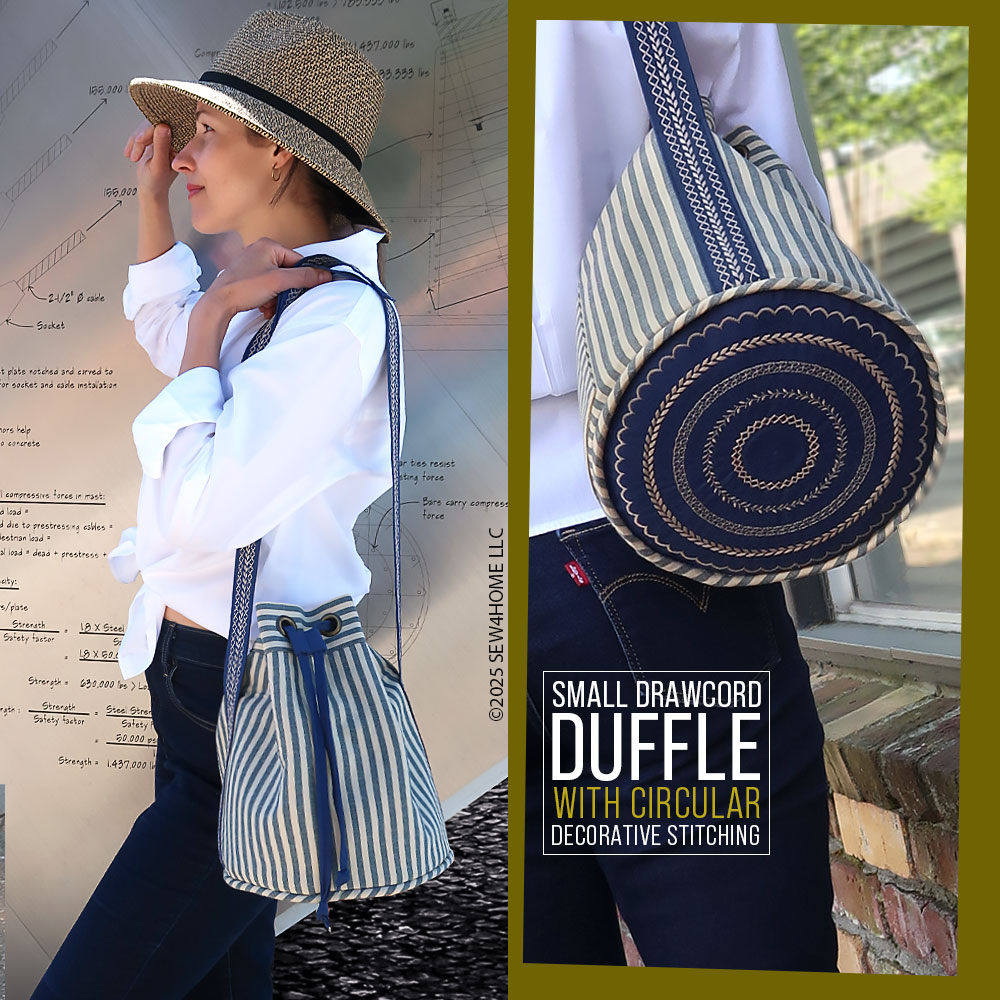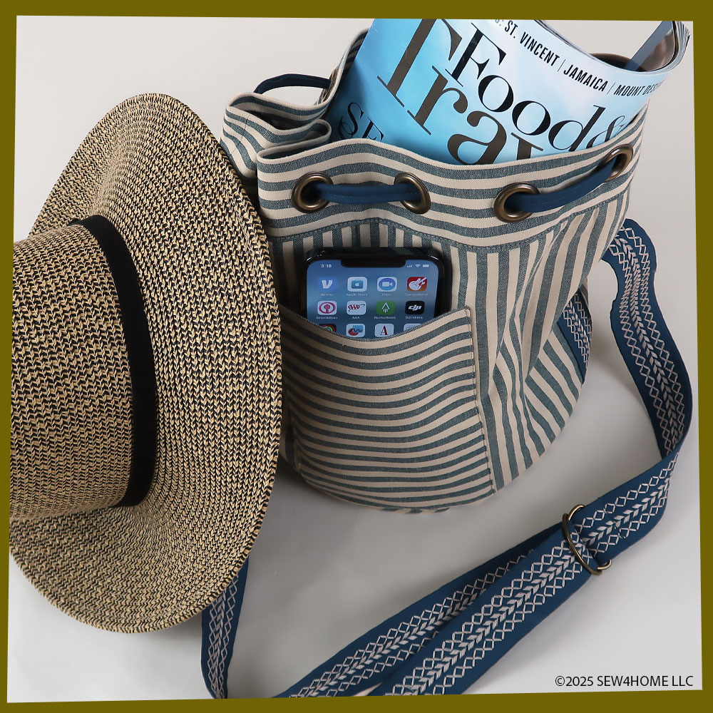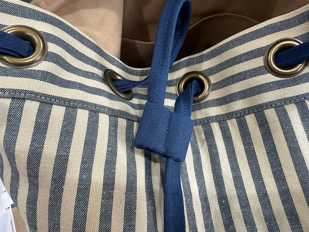 Our striped fabric gave us the opportunity to cut the various pieces that make up the bag in a variety of directions: vertical for the main body, horizontal for the pocket and the grommet panel, and diagonal (on the bias) for the accent piping. The finished duffle has a feel that would be right at home on the boardwalks of Nantucket — both its classic navy and tan palette as well as the sleek yet sporty style… in case you are planning a vacation at the Cape!