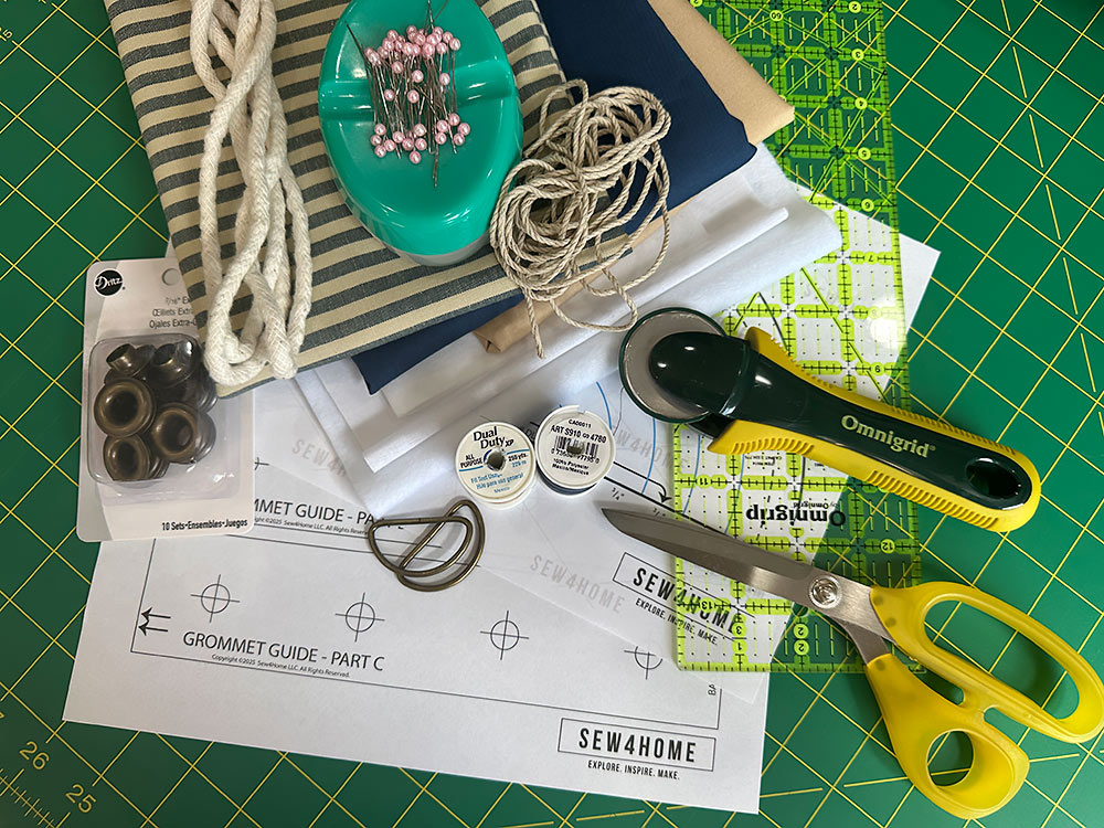 - 1 yard of 44”+ wide quilting weight fabric for the main exterior panel, grommet panel, exterior pocket, and base piping; we originally used Haberdashery Yarn Dyed Cotton Stripe in Blue from Marcus Fabrics