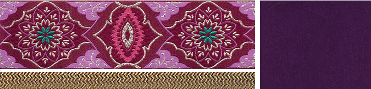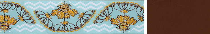 We used EIGHT beautiful jacquard ribbons from Renaissance Ribbons. The amount of ribbon you need depends on your embellishment design. For the vertical design, plan on 1 yard. For the vertical design plus the strap, plan on 1½ yards. For the horizontal design, plan on 1½ to 2 yards in order to get a precise fussy cut. For just the strap, plan on ½ yard. As a guide, we’ve listed our pairings below.