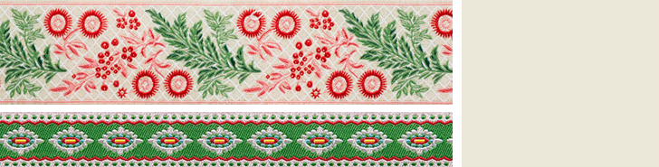 Case 4: 1½” Red & Green Garland on Ecru by French General bordered on either side with ⅝” Scalloped & Dotted Edge Holiday Motif on Green by Dena Designs on French Vanilla denim with a fabric strap accented with the same ⅝” Scalloped & Dotted Edge Holiday Motif on Green by Dena Designs
