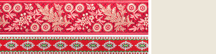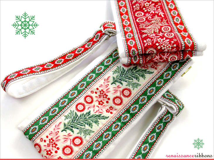 Case 5: 1½” Ecru Garland on Red by French General bordered on either side with ⅝” Scalloped & Dotted Edge Holiday Motif on Red by Dena Designs on French Vanilla denim with a fabric strap accented with the same ⅝” Scalloped & Dotted Edge Holiday Motif on Red by Dena Designs