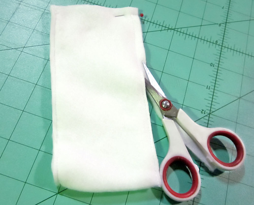 - Using a ¼” seam allowance, stitch along each side of the “cuff” – from the top folded edge to the bottom of the ½” fold (on each end). Clip the upper corners, being careful to not cut into your seam.