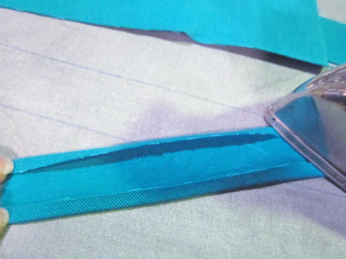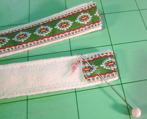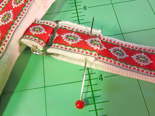- At the opposite end, wrap the excess ribbon back over the raw end and pin in place. It will be stitched in place when the strap is attached.