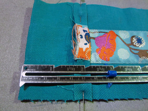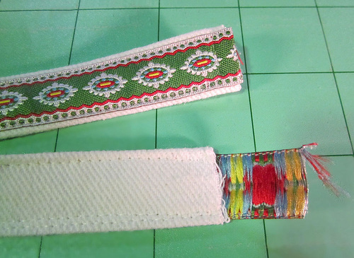 - After the edgestitching, center the ribbon on the strap. It should be flush on one raw end and extend beyond opposite raw end by ½”.