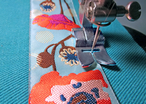 , to the wrong side of the ribbon. Read and follow the manufacturer’s instructions, and test to make sure the ribbon can be easily stitched without the adhesive gumming up the needle. Some adhesives are not meant to be sewn through.Project Design: Alicia Thommas
