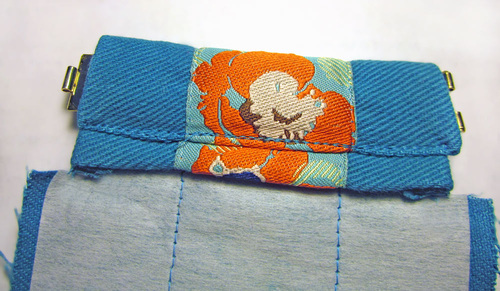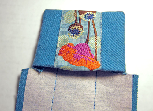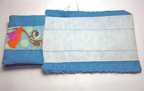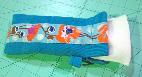 The background for the ribbon is a supple denim; a good combination with the soft fleece we chose for the lining. However, if you are concerned about your skill level when working with thicker fabrics on a small project, or are worried your sewing machine might not be up to the task, you could substitute a standard quilting weight cotton for the exterior.