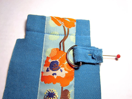 - Flip over the exterior panel so it is right side up. Find the D-ring with its loop in place. Place the loop just below the casing. The raw ends of the loop should be flush with the raw edge of the exterior panel and the D-ring should be facing the center of the case. Pin or baste in place.
