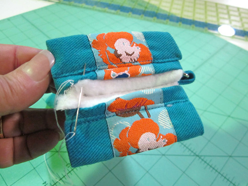 - Turn the exterior case right side out through the top opening. Carefully push out the bottom corners with a long, blunt end tool, such as a chopstick or knitting needle. You can also gently pick out the corner from the right side with a needle.