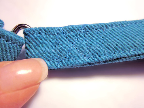 - Cut 2″ from one end. Loop this tab through the D-ring. Align the raw ends and stitch across the ends to secure the loop through the ring.