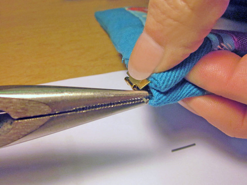- Crimp down the small top tab on each hinge. Again, pliers are best for this.